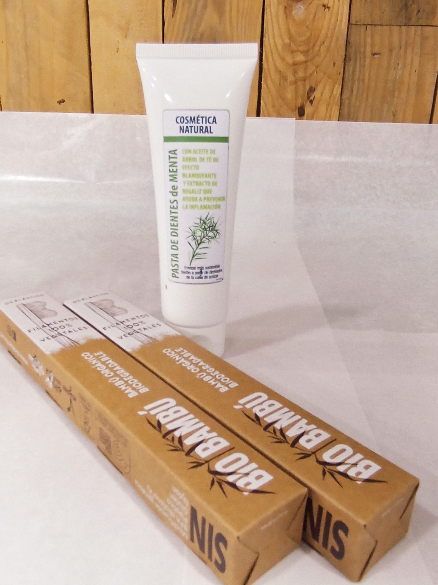 Lote dos cepillos de dientes biodegradables Bambú y pasta de dientes menta eco