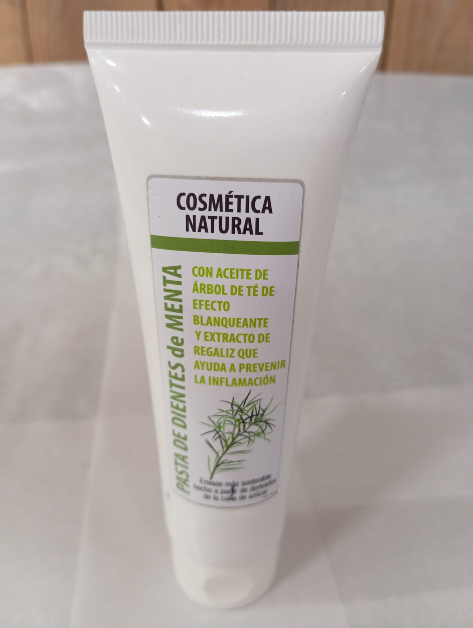 Pasta de dientes con árbol de té (efecto blanqueante) y extracto de regaliz (efecto antiinflamatorio) , sabor menta. ¡Aliento fresco y duradero! Sin flúor ni SLS. Sin caja de cartón y el envase es un tubo biodegradable, elaborado a partir de caña de azúcar