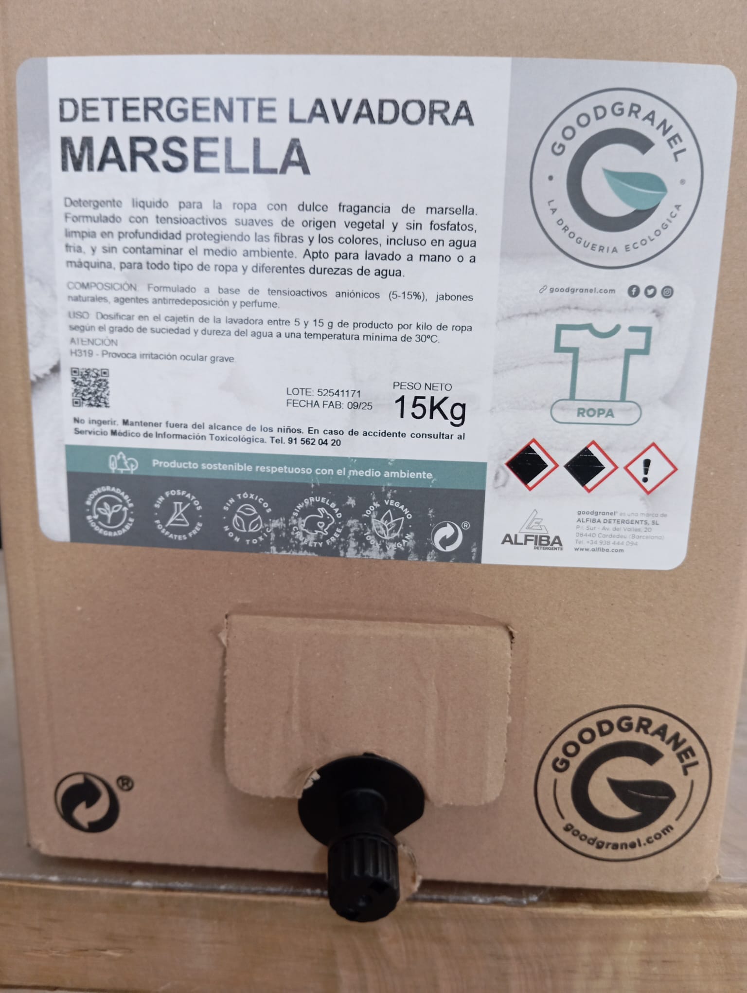 Detergente líquido para la ropa con dulce fragancia de marsella. Formulado con tensioactivos suaves de origen vegetal y sin fosfatos, limpia en profundidad protegiendo las fibras y los colores, incluso en agua fría, y sin contaminar el medio ambiente. Apto para lavado a mano o a máquina, para todo tipo de ropa y diferentes durezas de agua.