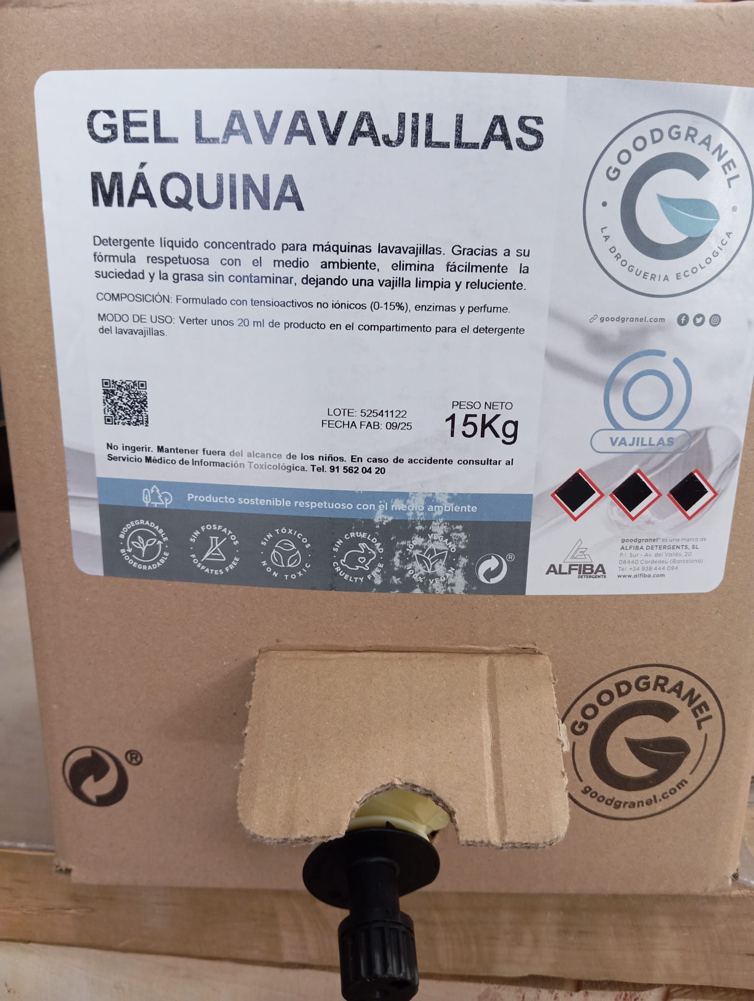 Detergente líquido para máquinas lavavajillas. Gracias a su fórmula respetuosa con el medio ambiente, elimina la suciedad y la grasa sin contaminar, dejando una vajilla limpia y reluciente.