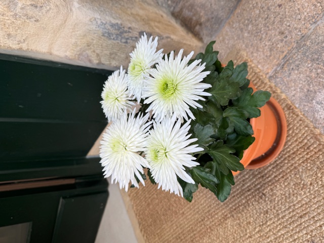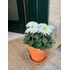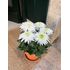 Planta crisantemo araña con flores blancas. Mide unos 30 cm de altura.