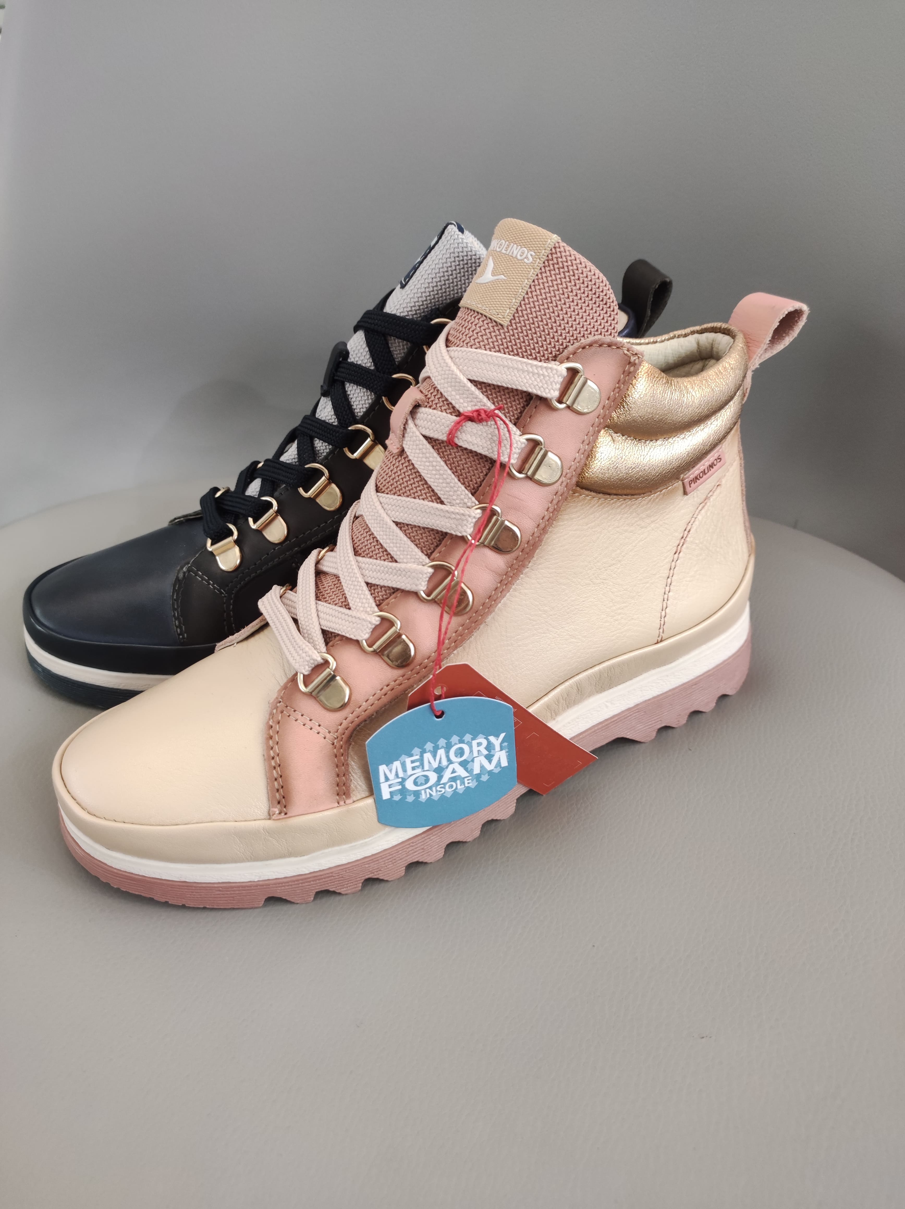 Botín sport de señora de la marca Pikolinos, fabricado en piel con cordones y cremallera en un lateral. Plantilla antómica extraíble de gel. Todos los beneficios obtenidos con la venta del color beige son destinados a la investigación contra el cáncer de mama.