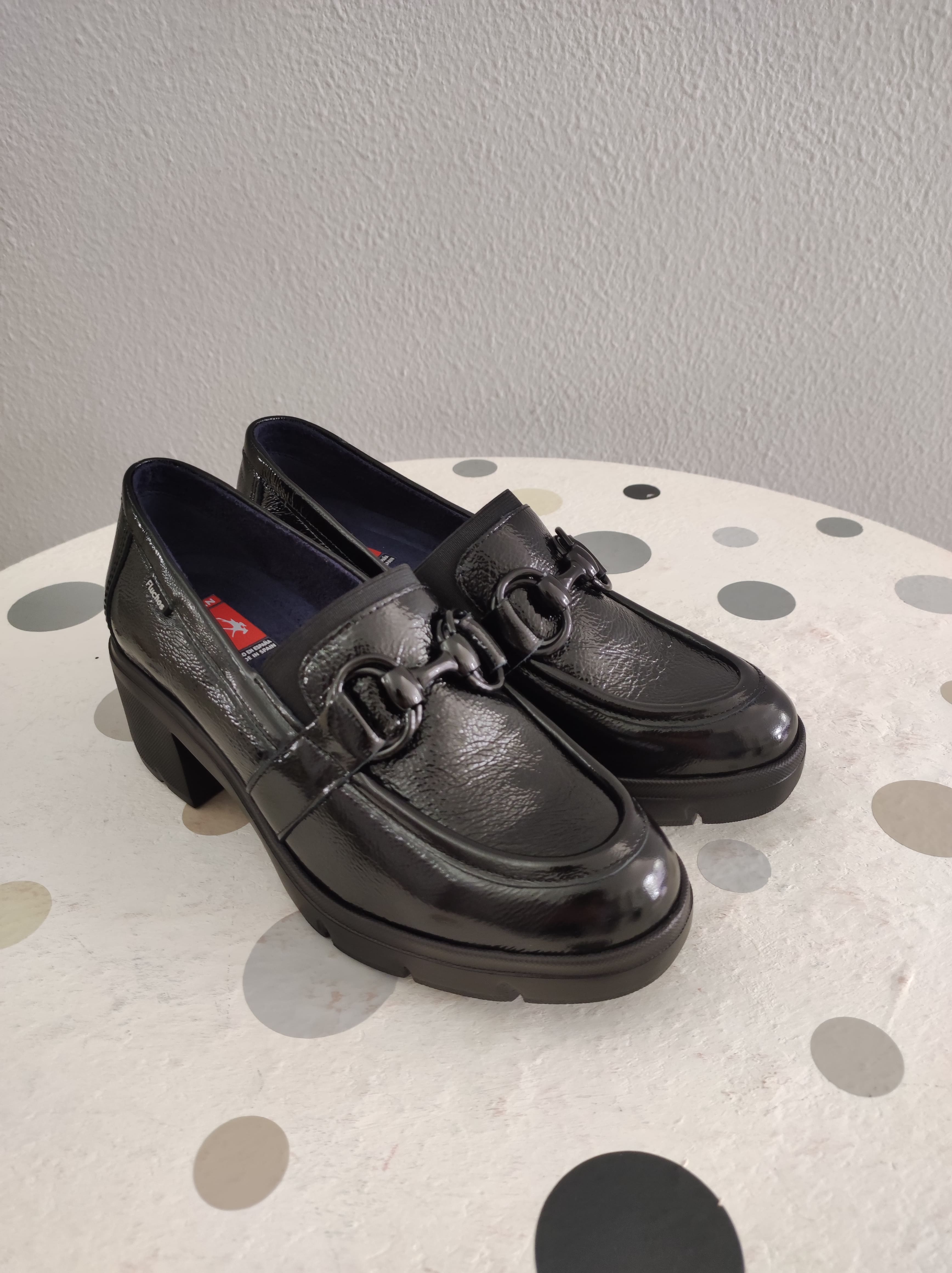 Mocasín de charol con tacón de 3 centímetros. Plantilla extraíble, piso ultraligero y fabricado por la marca española Fluchos.