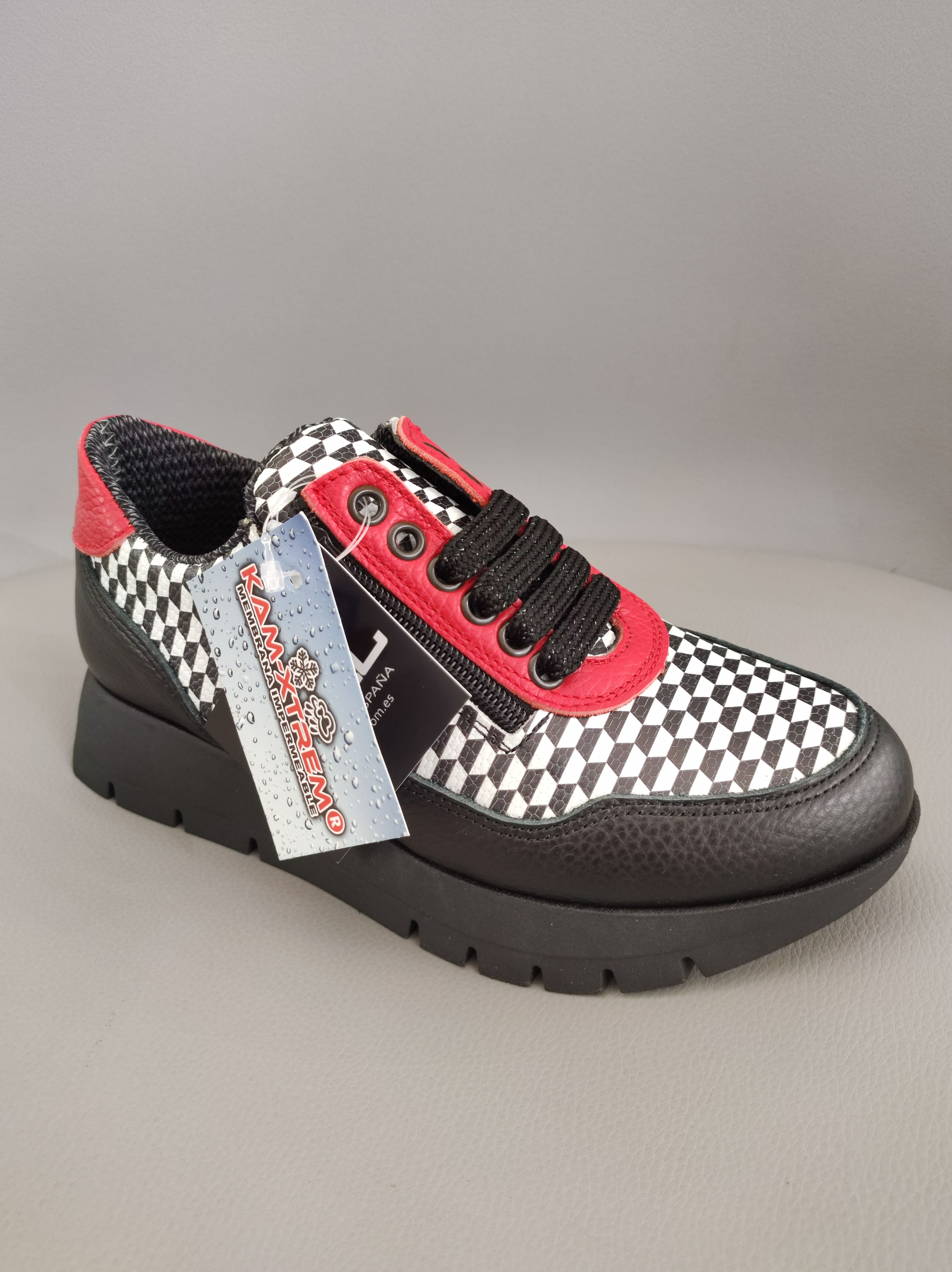 Zapato sport de señora fabricado en pieles de primerísima calidad de la marca española Nival. Piso de goma antideslizante y membrana waterproof. Plantilla extraíble de gel